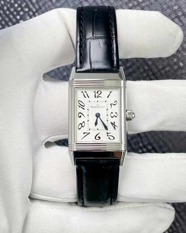 Jaeger LeCoultre Reverso Duetto Q2568402 ladies watch with reversible silver and black dials, black crocodile leather strap.