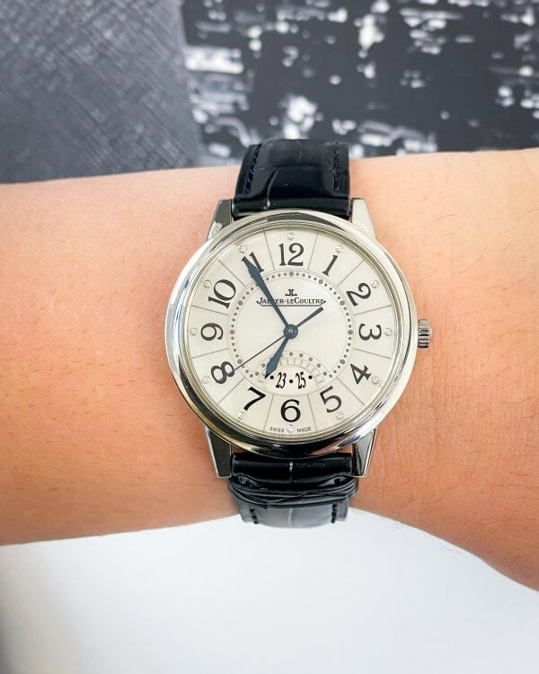 Jaeger LeCoultre Rendezvous 37mm watch with a silver mother of pearl dial and black crocodile leather strap.