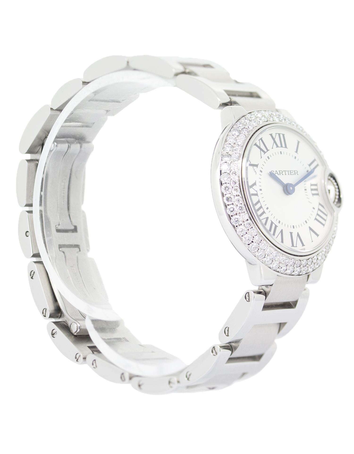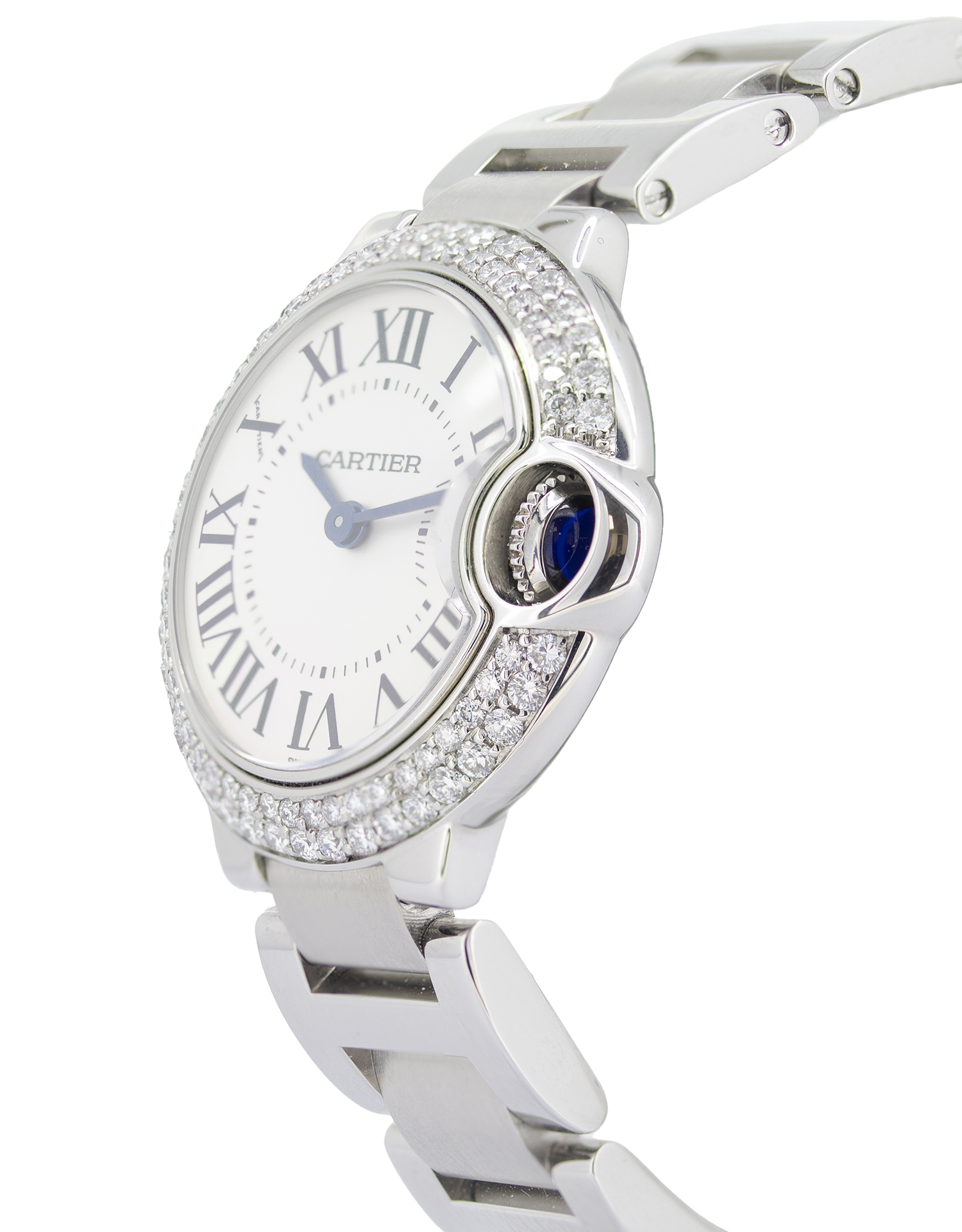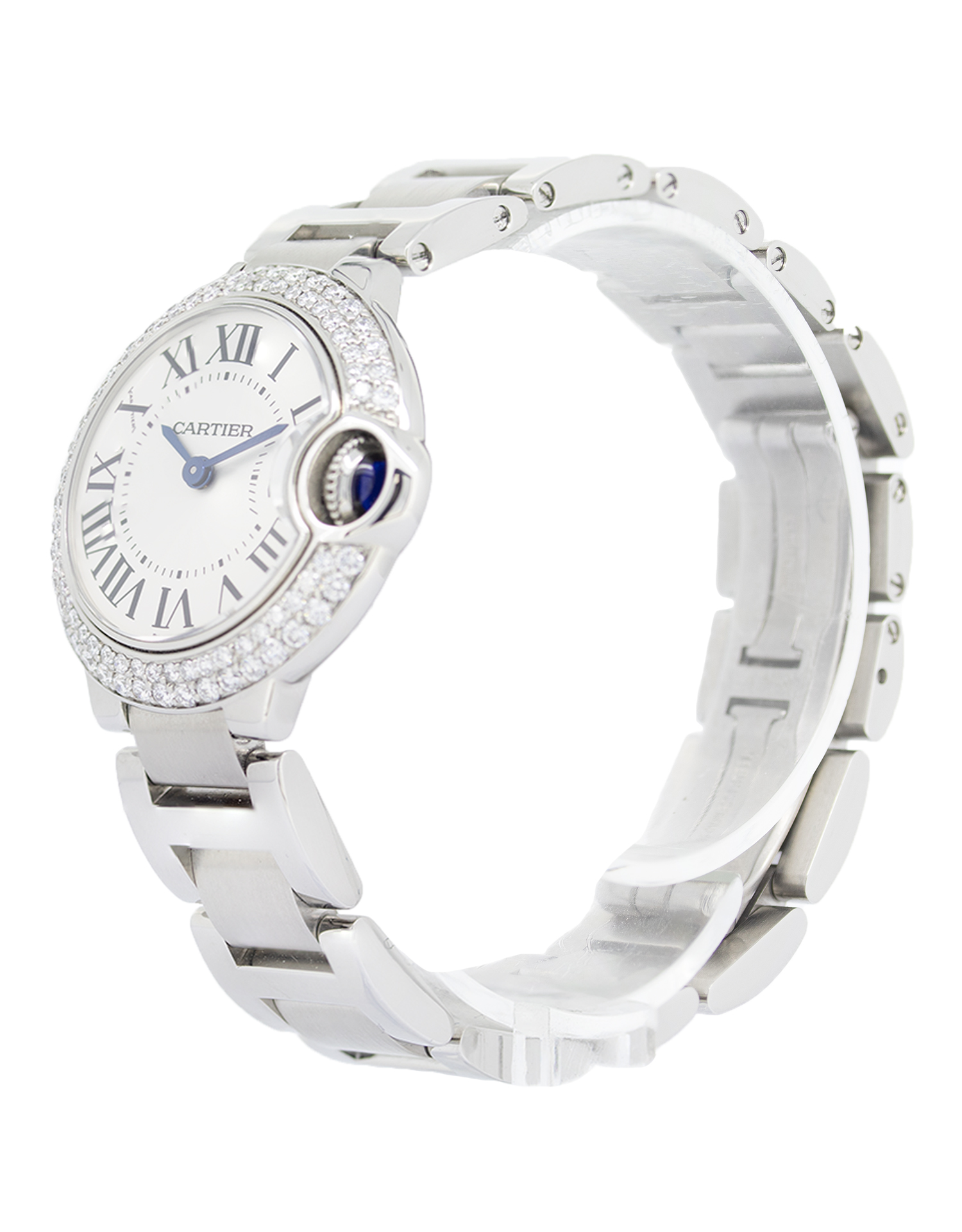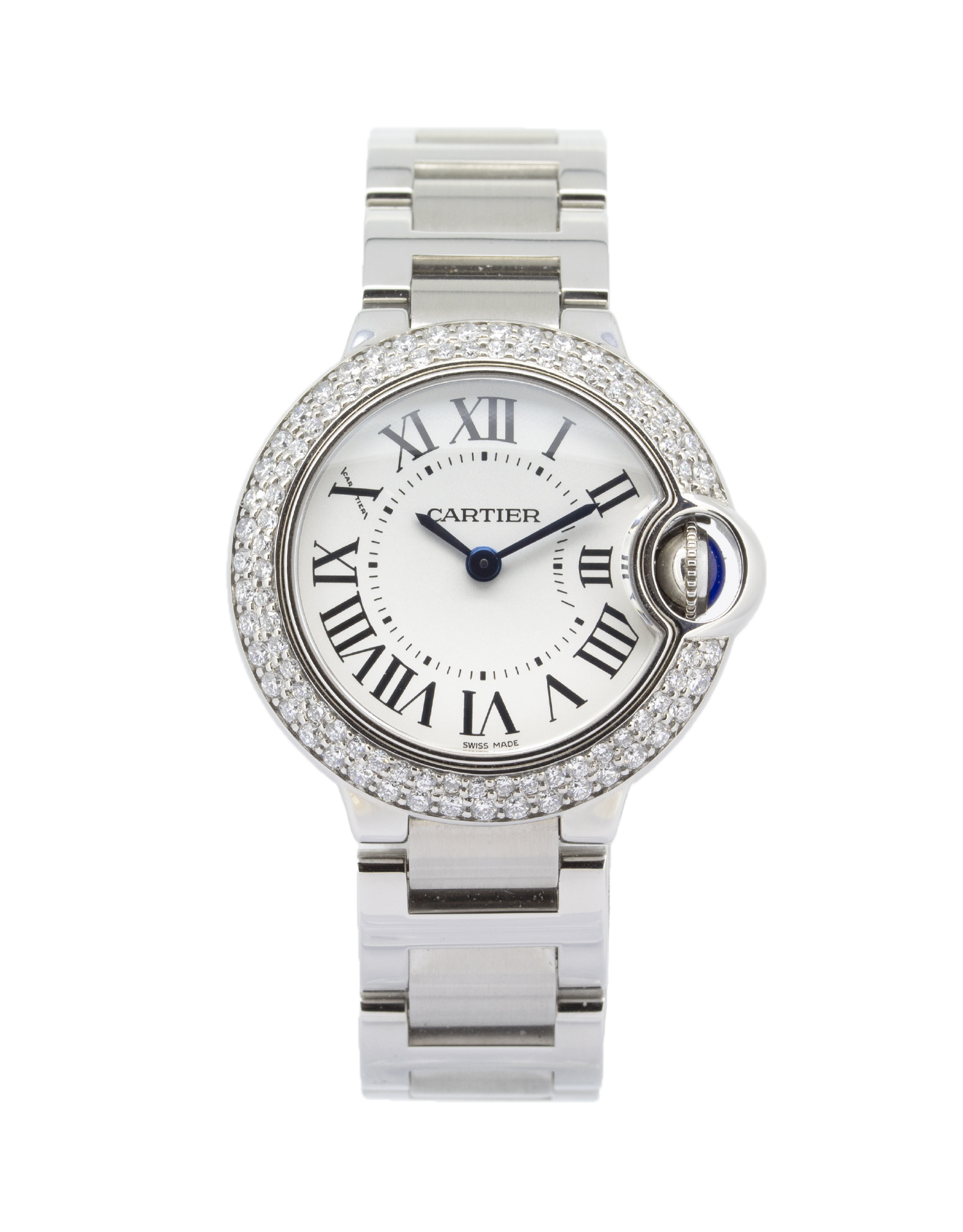 The beautiful Diamond Cartier Ballon Bleu showcases an exquisite white colour dial protected by scratch-resistant sapphire glass. The Stainless Steel bracelet is fitted with a hidden clasp. A stunning eye-catching Cartier timepiece that wears well on any occasion. This beautiful watch simply oozes class and sophistication!