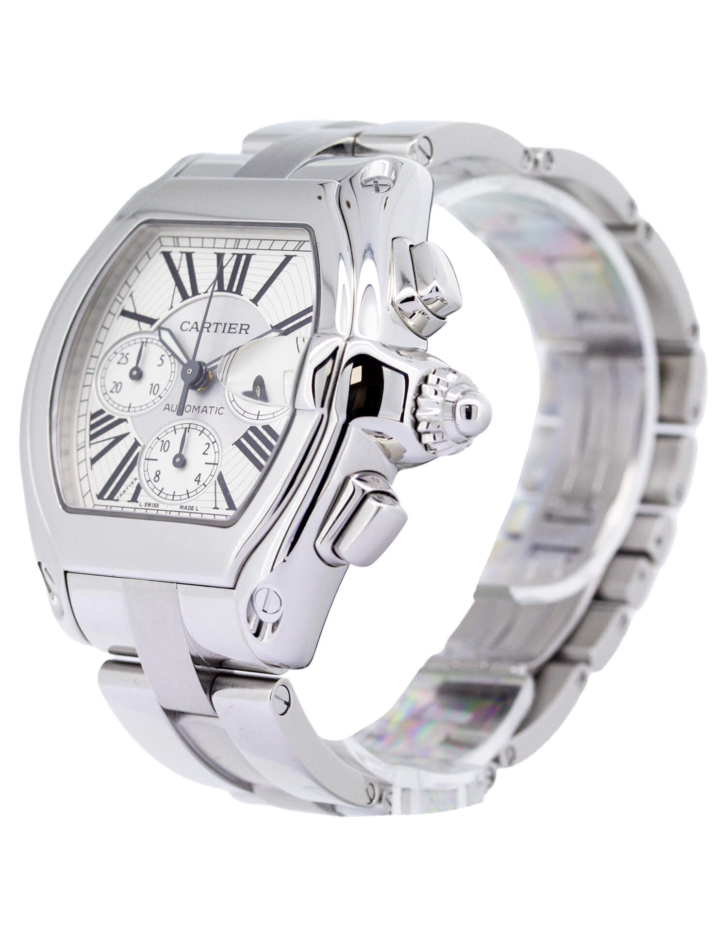 Cartier Roadster 2618 XL 43mm Chronograph watch with a silver dial, stainless steel case and bracelet