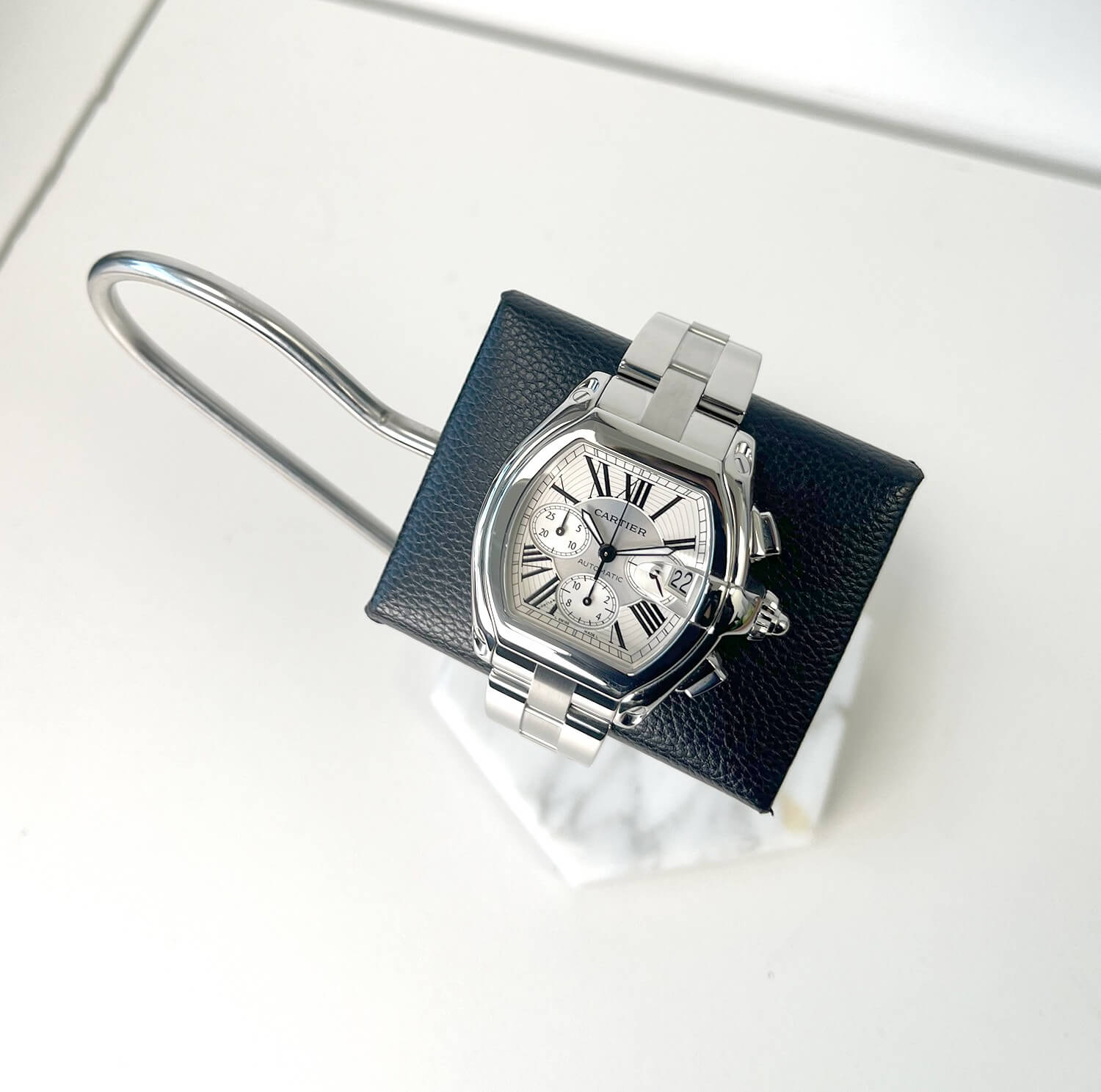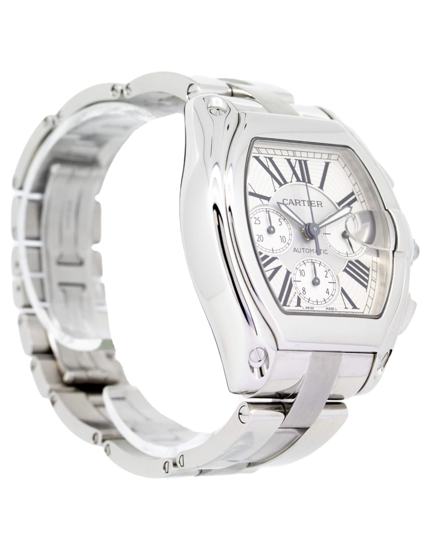 Cartier Roadster 2618 XL 43mm men’s automatic chronograph watch in flawless condition, serviced and polished! This sophisticated timepiece is quite striking with a stunning white and silver dial and a stainless steel case. The dial displays Roman numerals and is protected by scratch-resistant sapphire crystal glass. A real head turner on your wrist and perfect for any occasion!