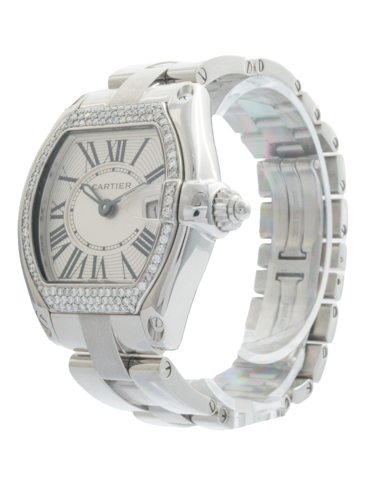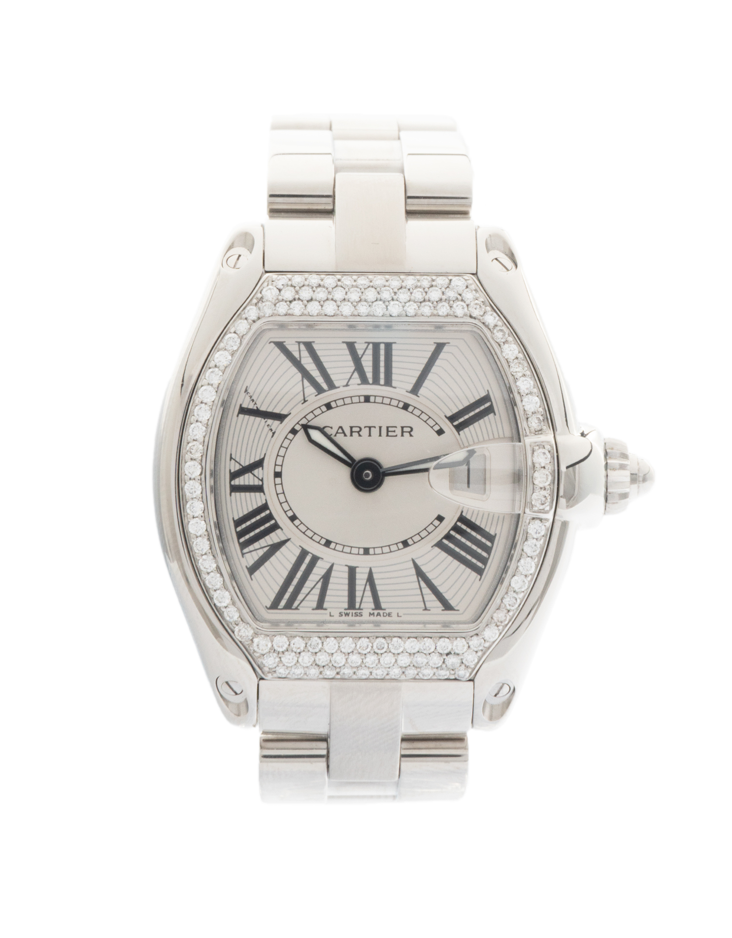 Cartier Roadster 2675 37mm with a silver dial, diamond set bezel and stainless steel bracelet.