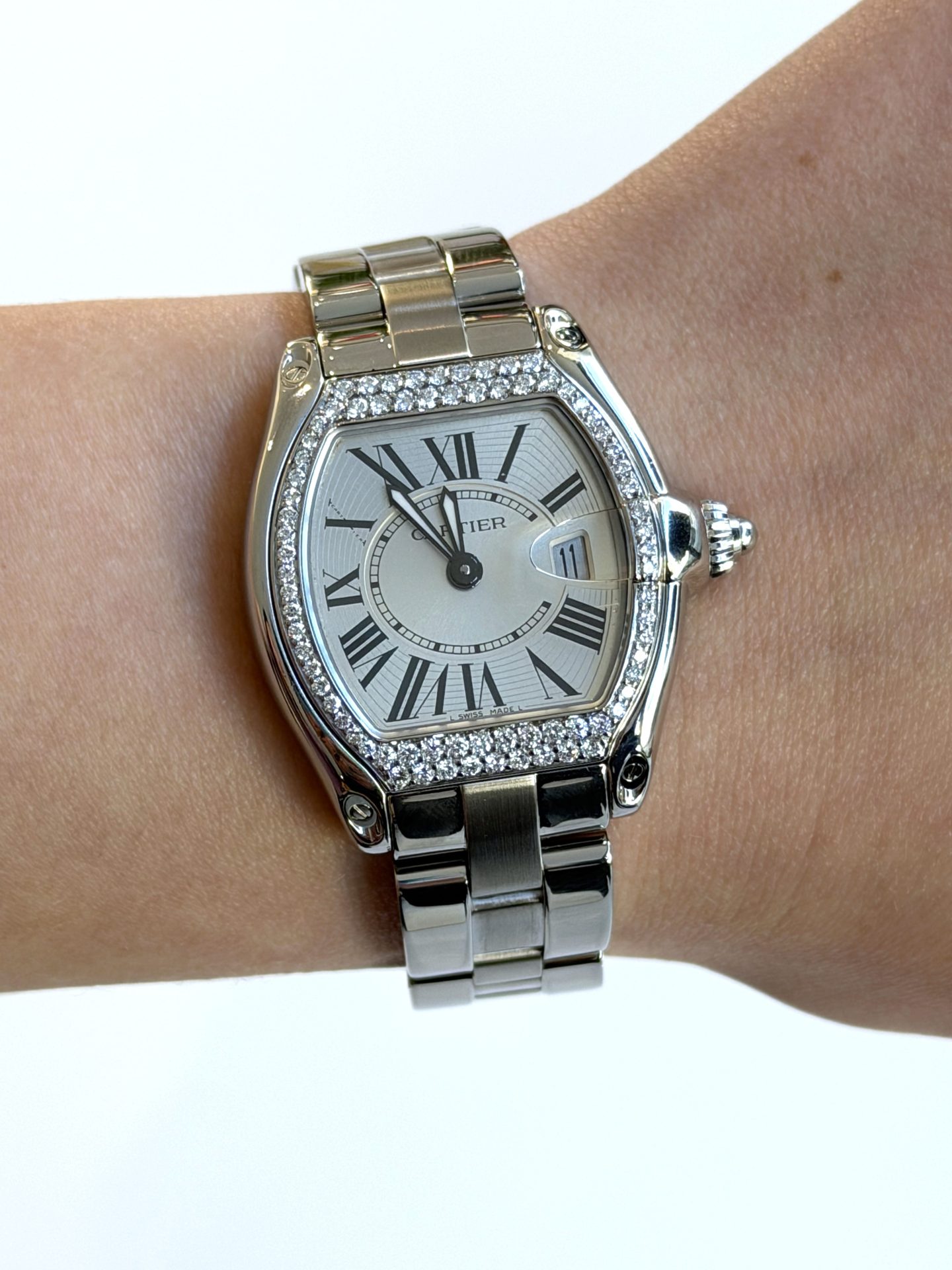 Cartier Roadster 2675 37mm ladies luxury diamond ladies watch in pristine newly serviced and polished condition. This sought after luxury quartz watch displays a 37mm x 32mm watch casing with a Silver Dial, Sapphire Crystal glass, Roman numeral indices and a date complication. The bezel is adorned by 0.92 carat Diamonds and looks absolutely stunning!