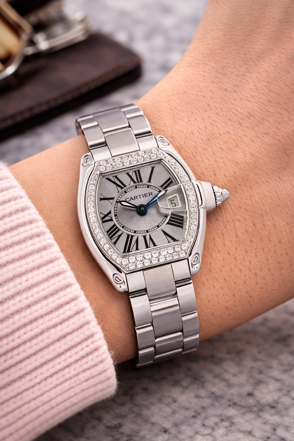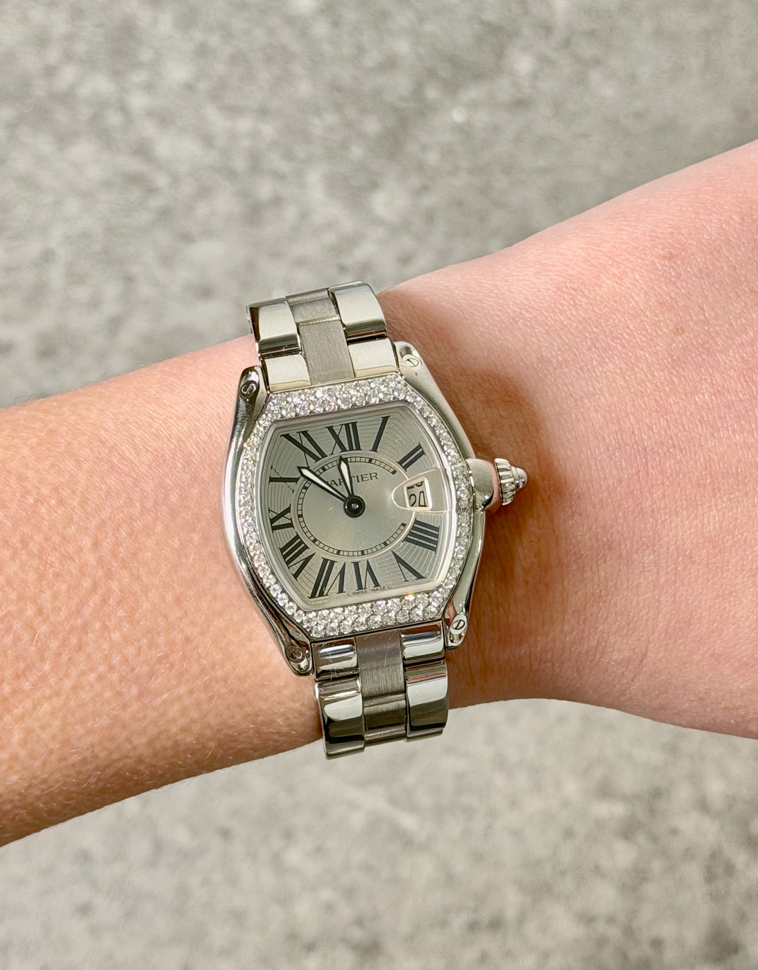 Cartier Roadster 2675 37mm ladies luxury diamond ladies watch in pristine newly serviced and polished condition. This sought after luxury quartz watch displays a 37mm x 32mm watch casing with a Silver Dial, Sapphire Crystal glass, Roman numeral indices and a date complication. The bezel is adorned by 0.92 carat Diamonds and looks absolutely stunning!