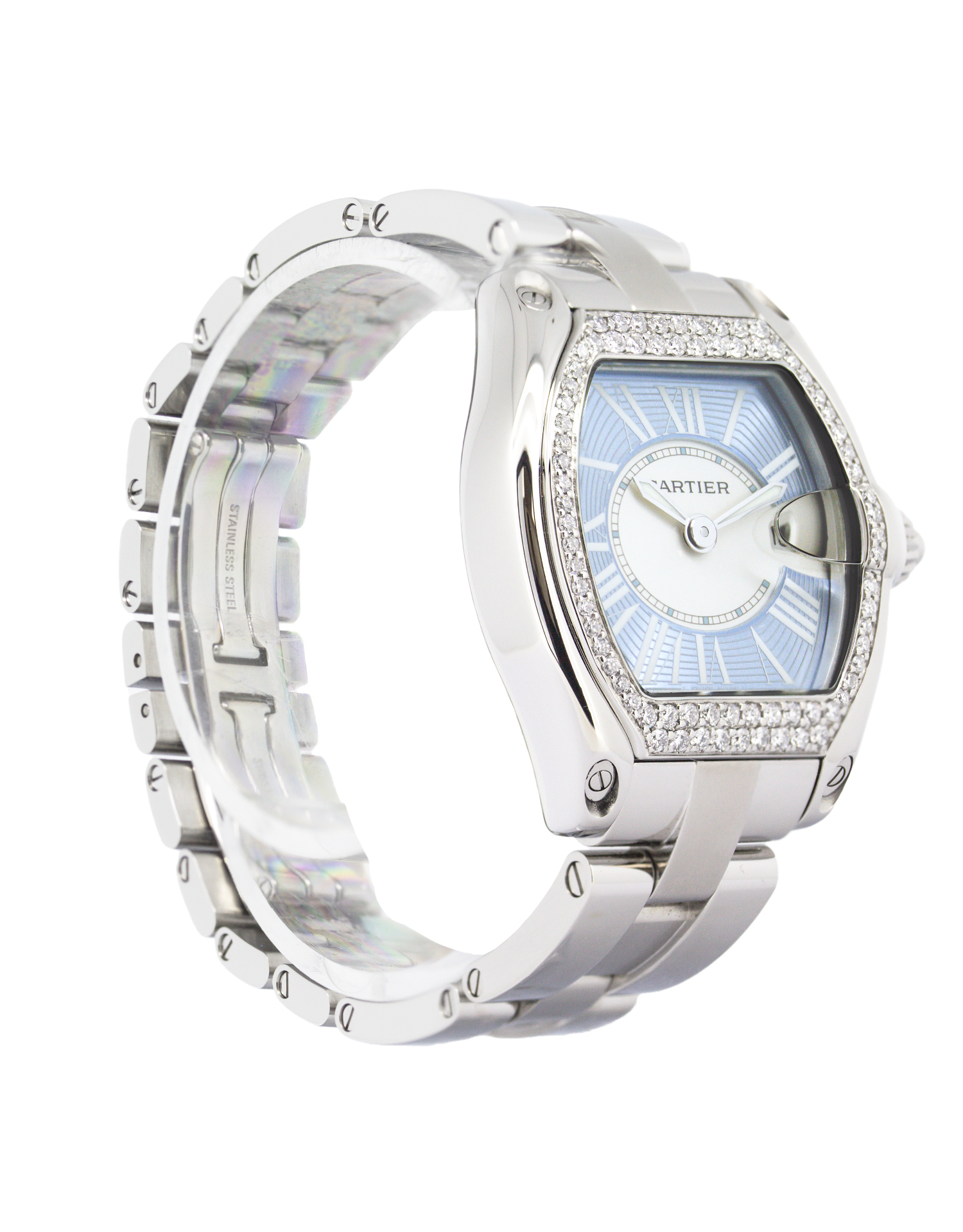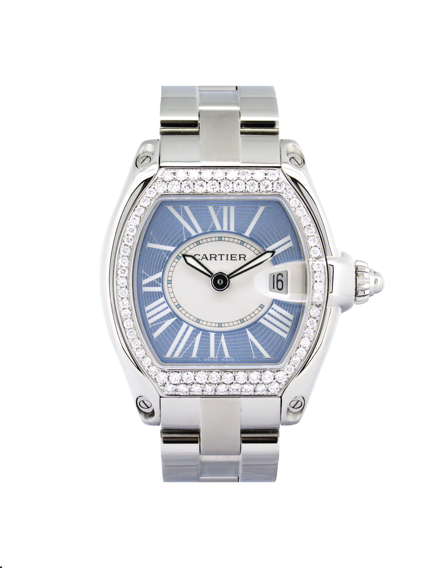 Cartier Roadster 2675 37mm Diamond bezel stainless steel case, steel bracelet, baby blue dial.