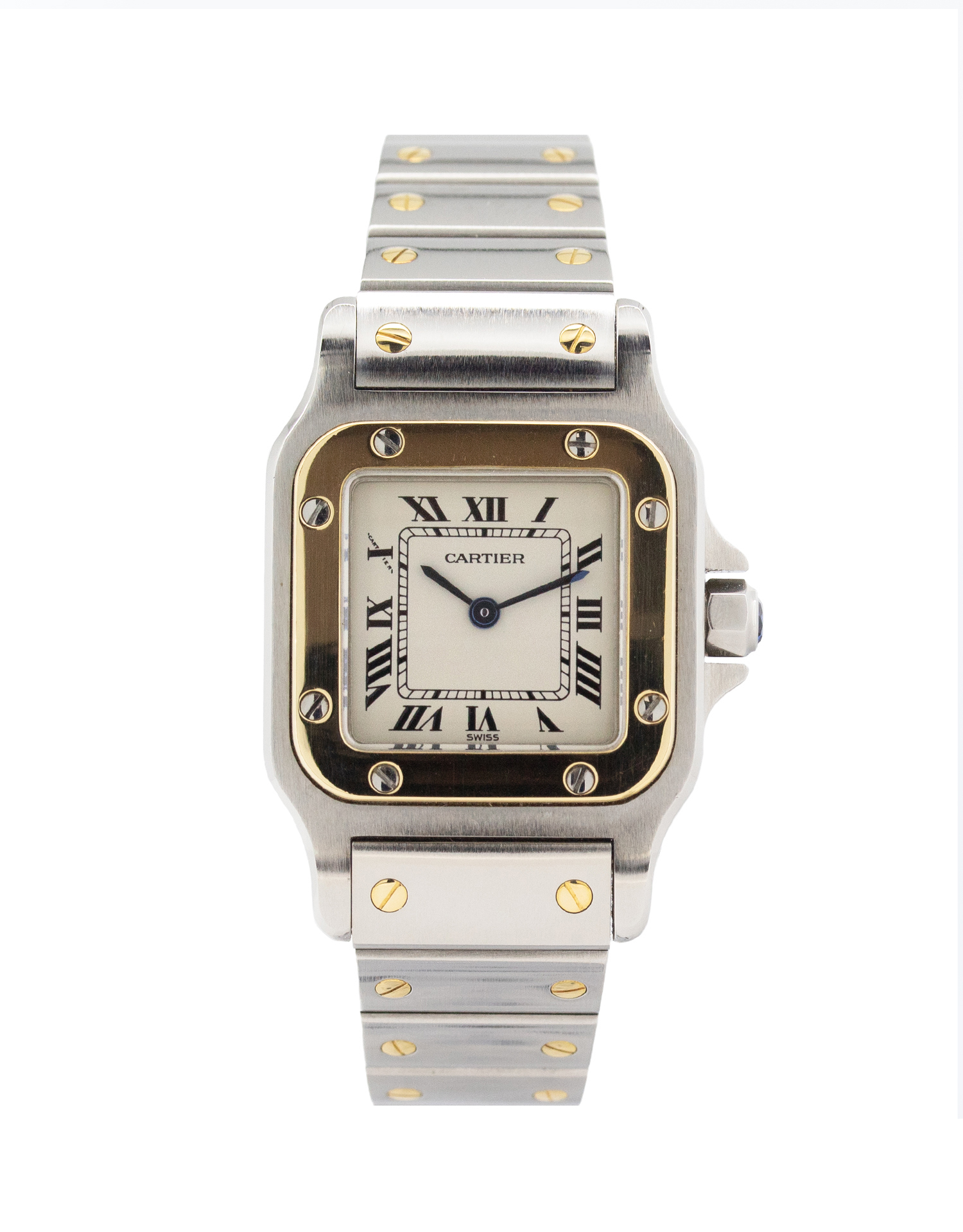 Sought after Cartier Santos Galbee 1567 Gold 24mm ladies Stainless Steel and 18k Yellow Gold watch in flawless condition, serviced and polished! This sophisticated timepiece is quite striking with a 24mm watch casing, ivory colour dial with Roman numerals and a blue set sapphire crown. The dial is protected by scratch-resistant sapphire crystal glass. A real head turner on your wrist and perfect for any occasion.