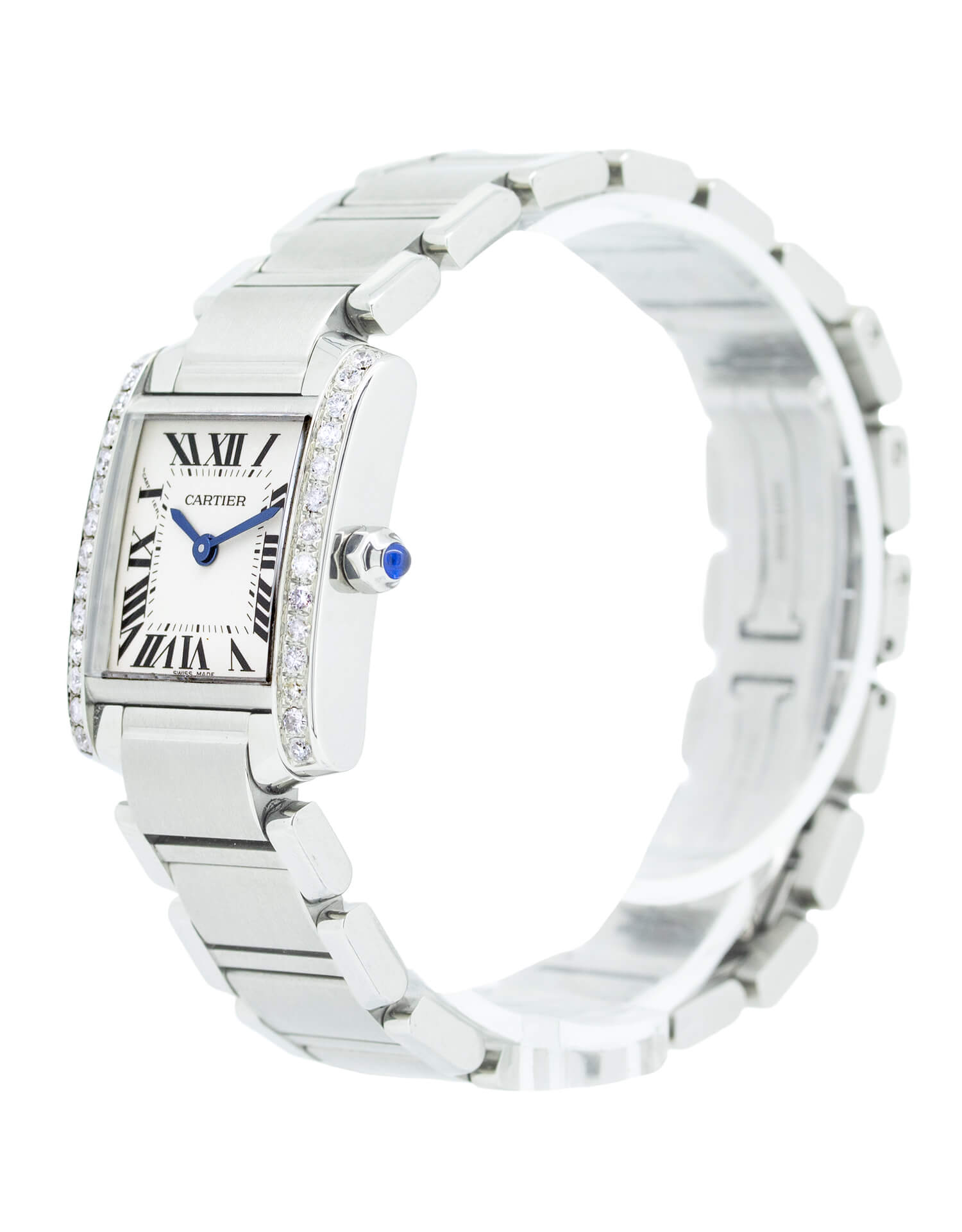 Cartier Tank Francaise 2384 diamond luxury ladies watch in pristine newly serviced and polished condition. This sought after luxury quartz watch displays a 20mm watch casing with a white dial adorned with custom sparkling diamonds, Sapphire Crystal glass, Roman numeral indices and a faceted blue set sapphire crown.