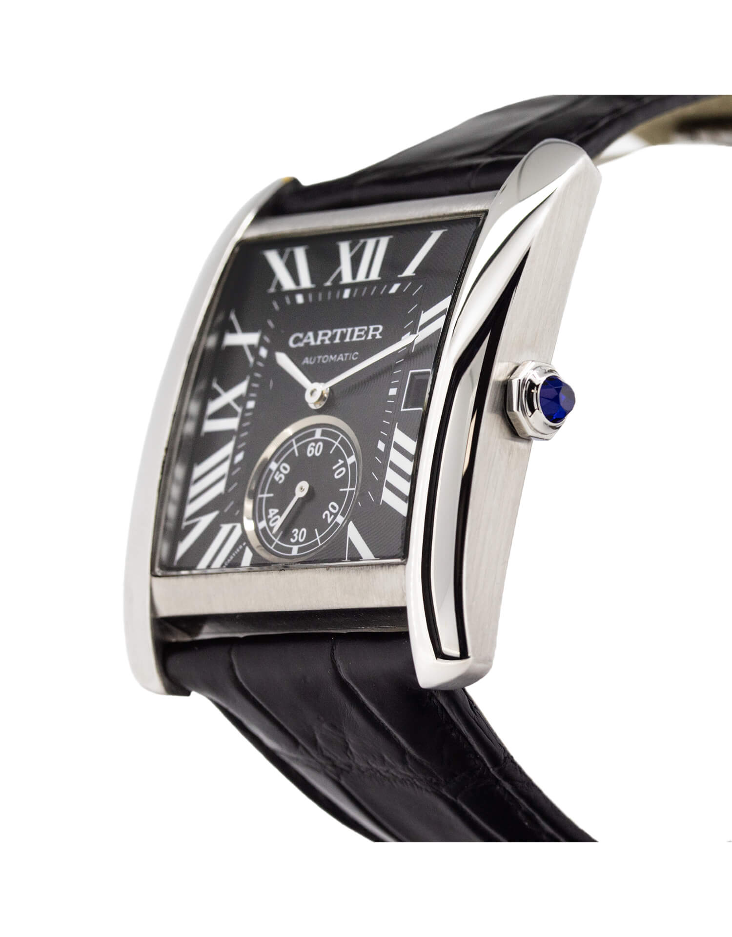 Stunning sought after Cartier Tank MC W5330004 Men’s watch in pristine newly serviced and polished condition. This luxury automatic watch displays a masculine 34mm x 44mm watch casing with a black sunburst dial, Roman numerals, stainless steel case and a black crocodile leather strap. A classic Cartier men’s watch and one of their finest timepieces.