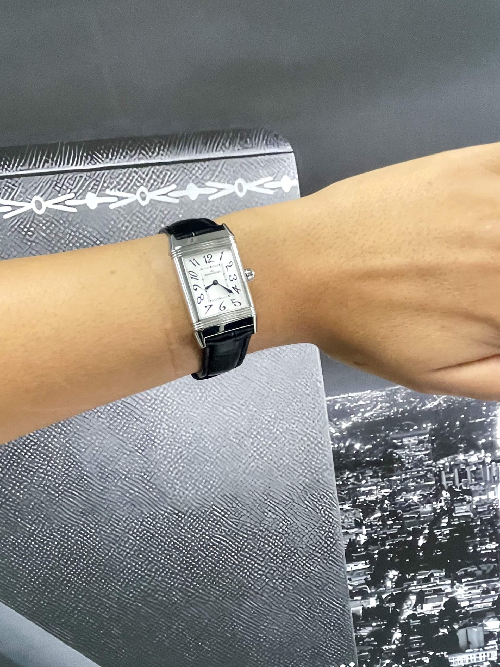 The unique reverso watch casing is adorned with factory set diamonds and protected by scratch-resistant sapphire glass. The freshly polished stainless steel case wears a black JLC crocodile strap with a deployment clasp. An exquisite eye-catching timepiece that wears well on any occasion. This beautiful watch simply oozes class and sophistication!