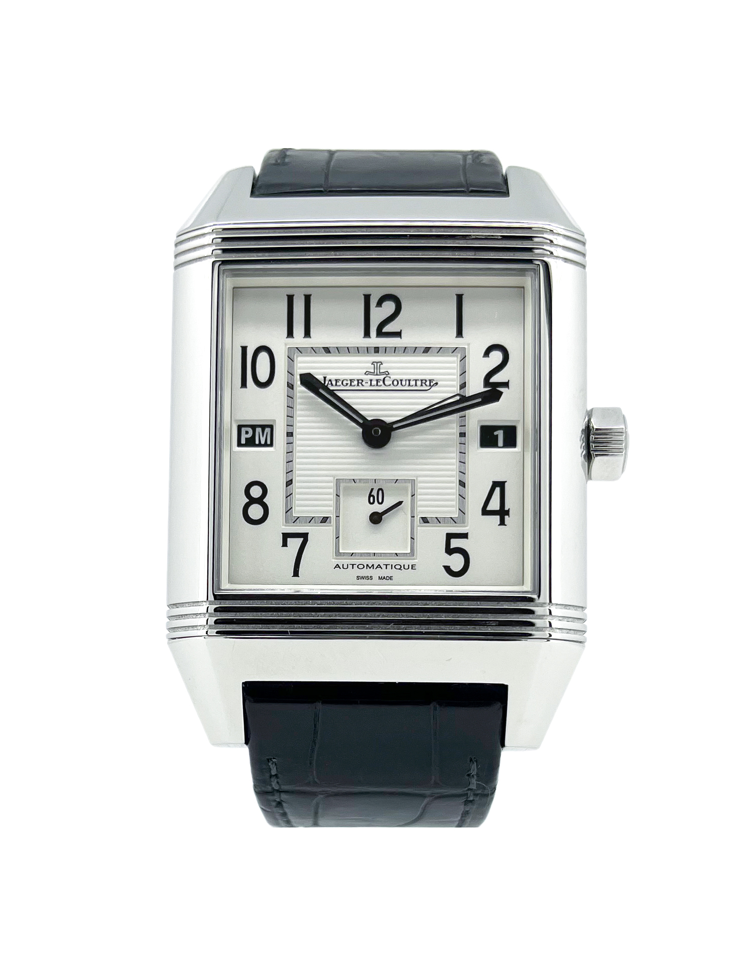 A true watch enthusiasts timepiece, the Jaeger LeCoultre Reverso Squadra Hometime Q7008420. A Luxury GMT men’s watch with a sleek reversible exhibition caseback . This desirable Reverso model displaying a masculine 50mm x 35mm watch casing with a white dial, date complication and AM/PM indicators. Worn on a black JLC Crocodile leather strap with a signed deployment clasp.
