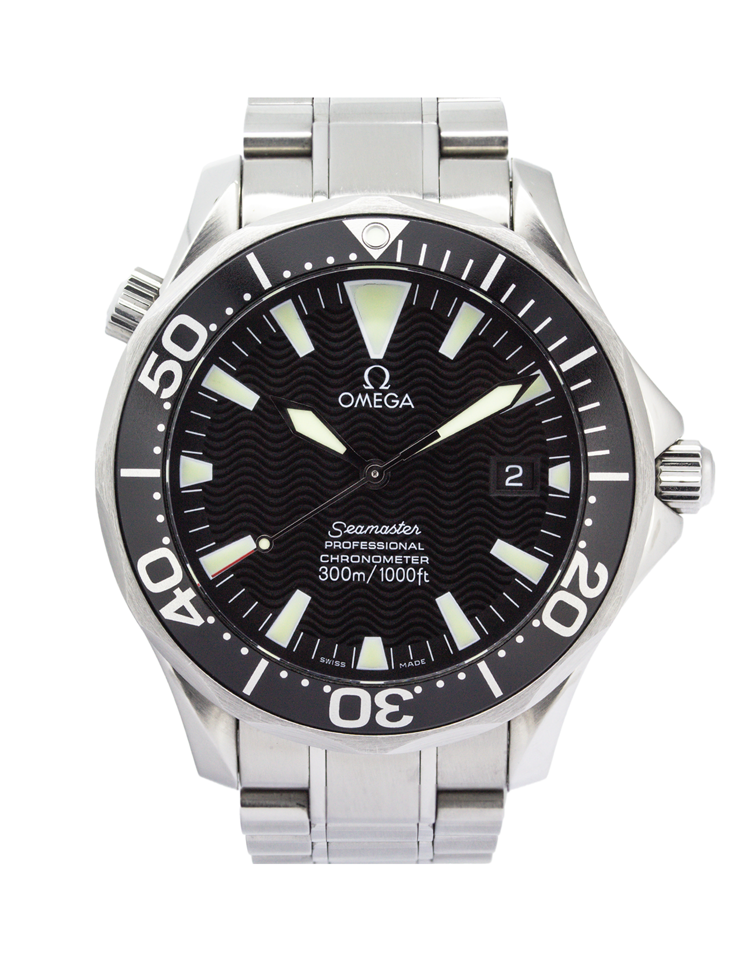 Sought after ‘James Bond’ Omega Seamaster Diver Professional 2254.50.00 41mm men’s automatic ‘full watch set’ in fantastic condition, newly serviced and polished. This sophisticated timepiece is quite striking with a stunning black wave pattern dial and a stainless steel case and bracelet. The dial is protected by scratch-resistant sapphire crystal glass. A real head turner on your wrist and the perfect watch for any occasion!