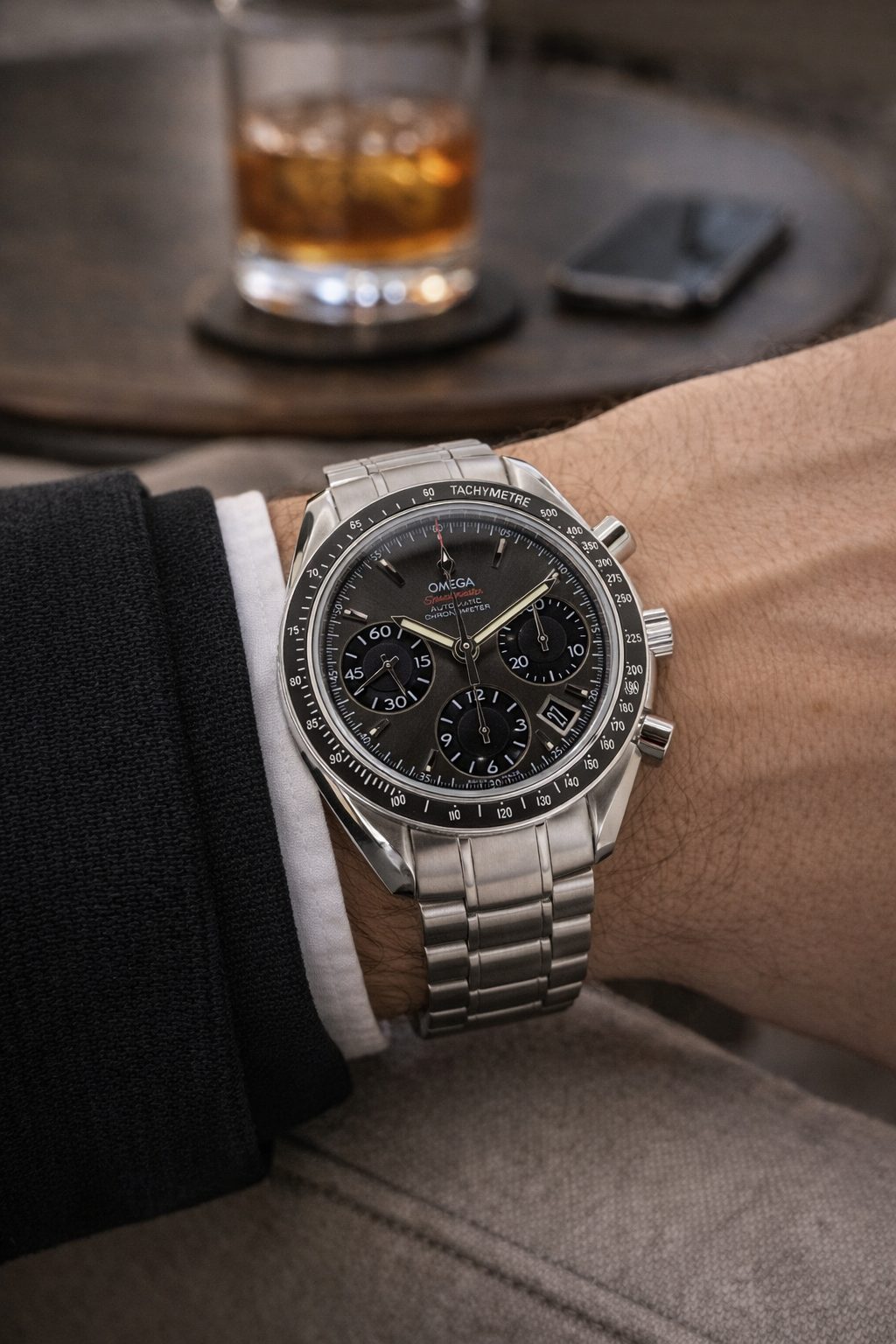 Omega Speedmaster Date 323.30.40.40.06.001 40mm men’s automatic chronograph watch. This sophisticated timepiece is quite striking with a stunning anthracite grey dial and a stainless steel case. The dial is protected by scratch-resistant sapphire crystal glass. A real head turner on your wrist and the perfect watch for any occasion!