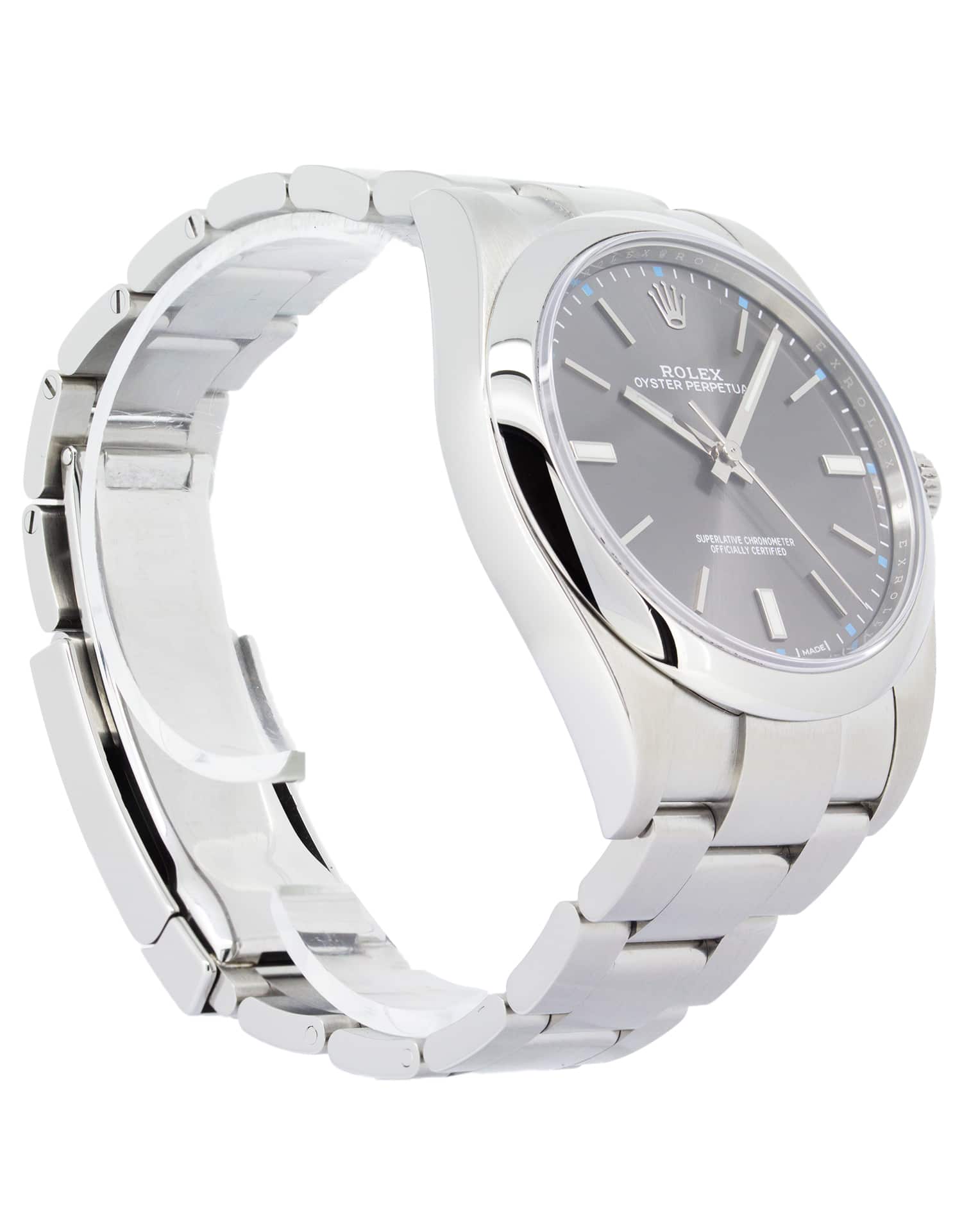 Rolex Oyster Perpetual 114300 39mm men’s automatic Stainless Steel watch with box and papers. This handsome watch displays a 39mm watch casing, rhodium grey dial with luminous hour markers, smooth bezel, sapphire crystal glass and worn on an oyster bracelet. Pure luxury on your wrist and a watch that can be worn to any occasion.
