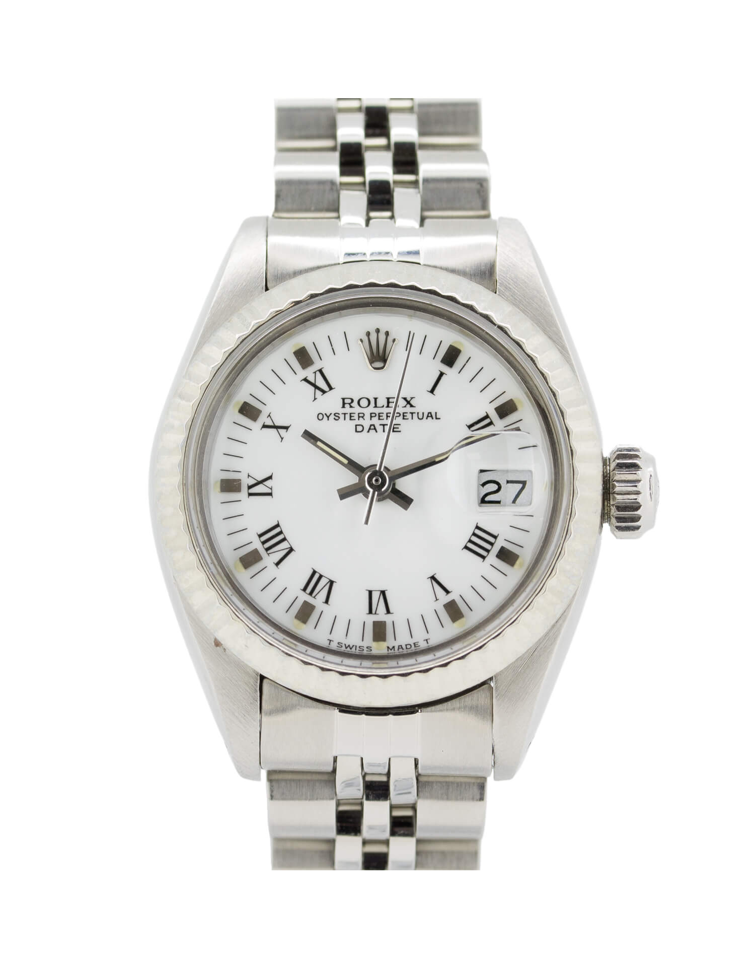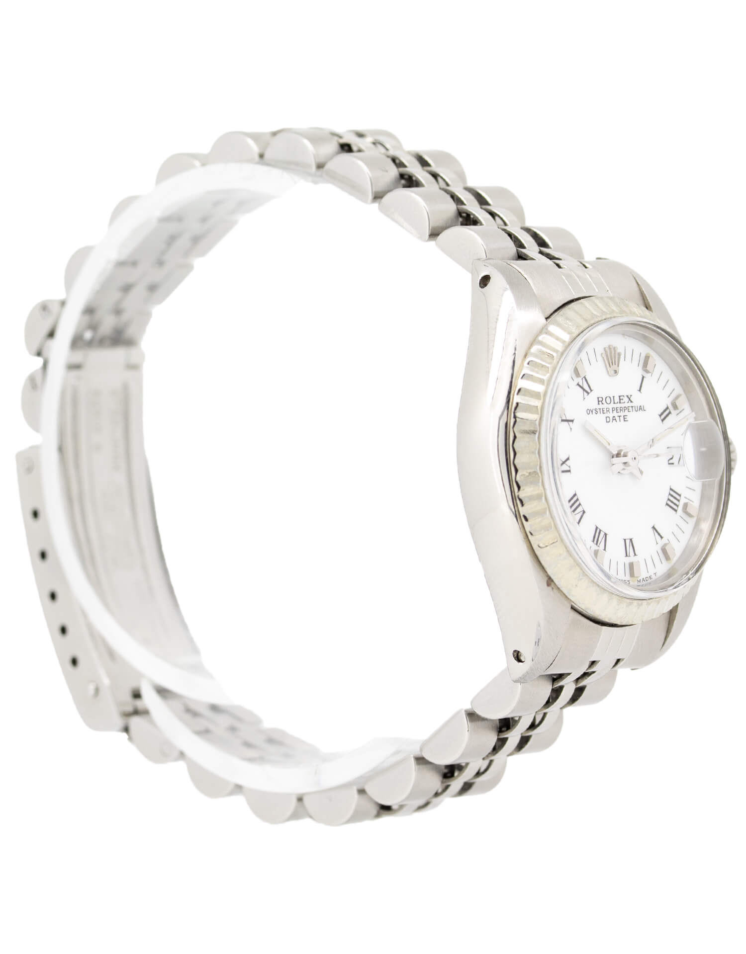 Luxury Rolex Oyster Perpetual Date 69172 26mm ladies automatic White Gold watch in pristine newly serviced condition with new glass and waterproof seals. This beautiful watch displays a 26mm watch casing, white dial with Roman numerals, fluted bezel and a newly polished jubilee bracelet. Pure luxury on your wrist and a watch that can be worn to any occasion. A full service and polish has been completed so you can be assured the watch is in perfect working order.