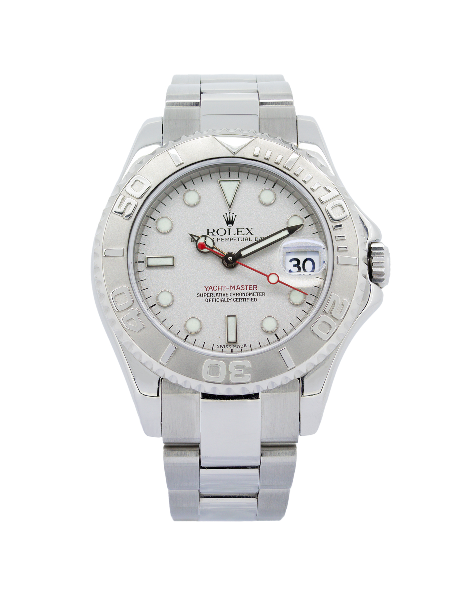 Rolex Yacht Master 168622 35mm unisex automatic Platinum watch. This pristine watch displays a 35mm watch casing, platinum dial with luminous hour markers, bidirectional bezel, sapphire crystal glass and worn on an oyster bracelet. Pure luxury on your wrist and a watch that can be worn to any occasion.