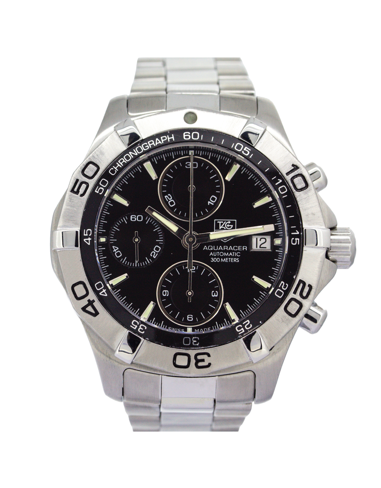 Tag Heuer Aquaracer CAF2110 watch with a black dial and stainless steel bracelet.