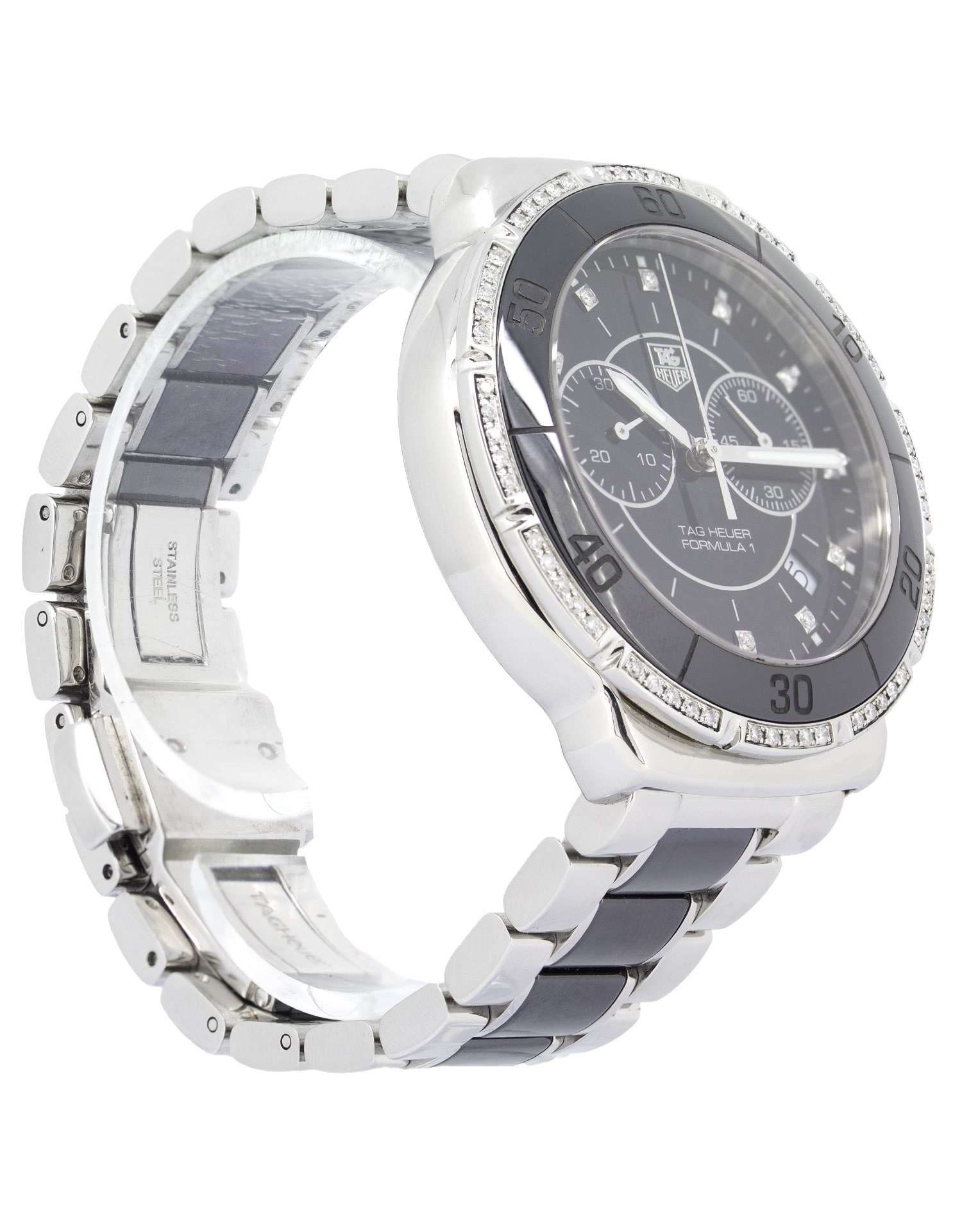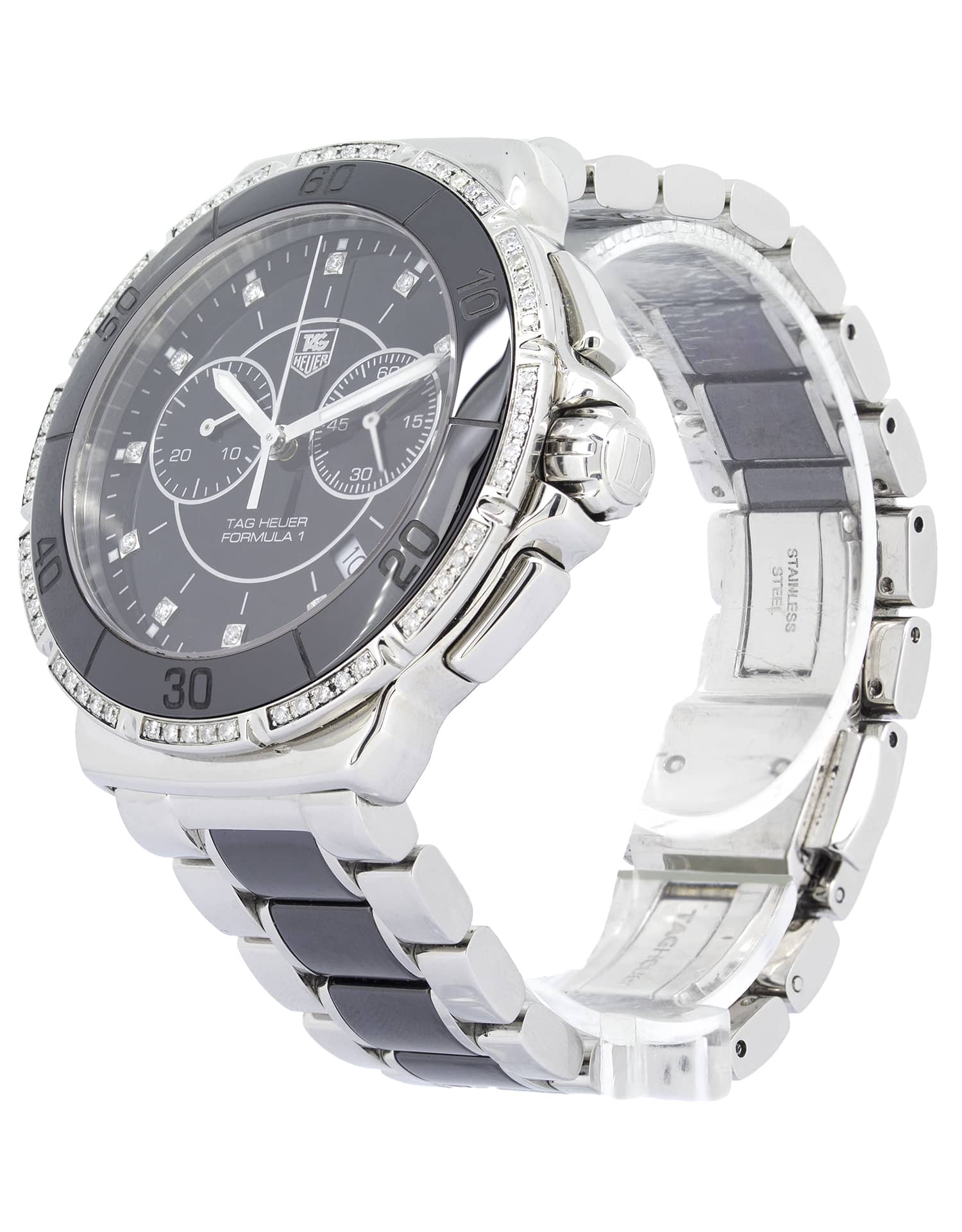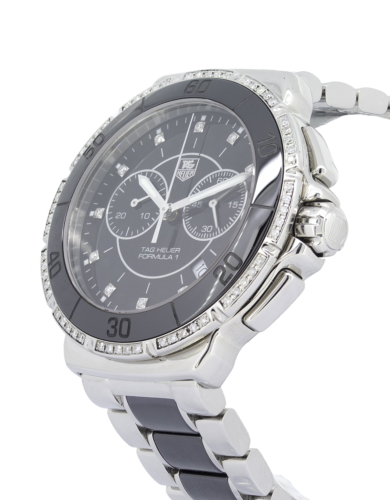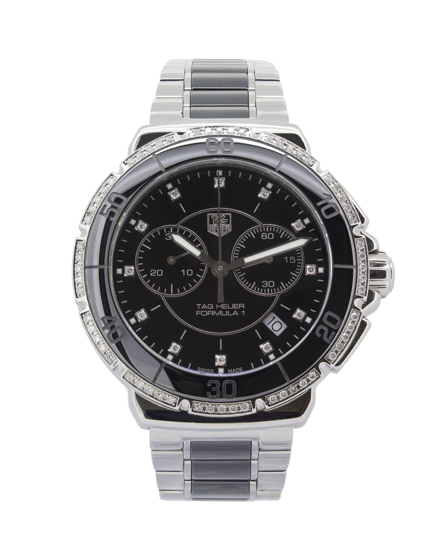 Tag Heuer Formula 1 CAH1212 Chronograph Diamond unisex Watch in flawless condition. This stunning timepiece is quite striking with a 41mm watch casing and a stunning black dial featuring 12 (0.53 carat) diamond hour markers and 60 diamonds around the bezel. Protected by scratch-resistant sapphire glass, this amazing watch for men and women is a real head turner on your wrist and perfect for any occasion.