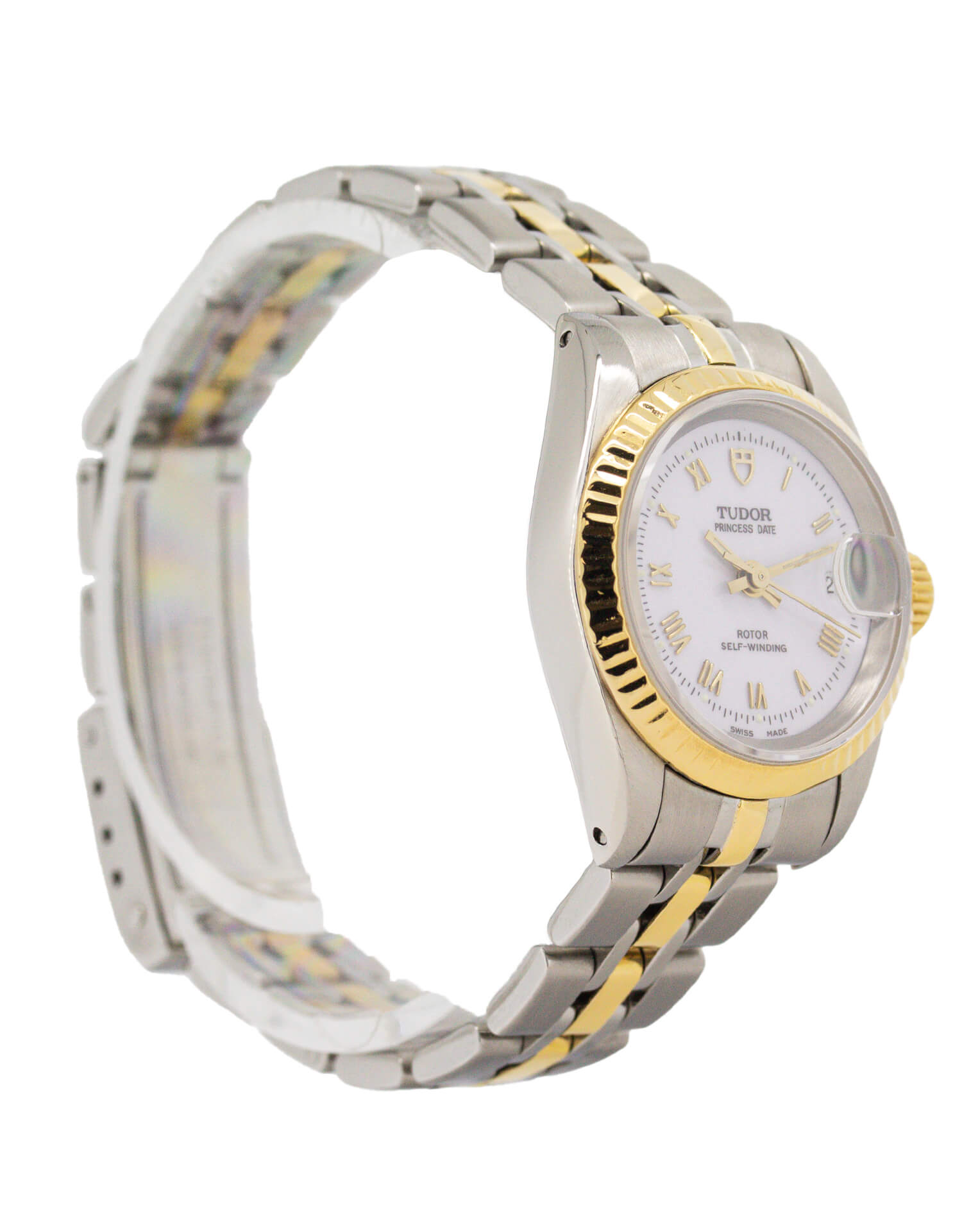 Luxury Tudor Princess Oysterdate 92413 ladies automatic Gold and Steel watch in pristine condition. This beautiful watch displays a 25mm watch casing, white dial with a fluted bezel and a polished bi-metal bracelet. Pure luxury on your wrist and a watch that can be worn to any occasion. A full service and polish has been completed so you can be assured the watch is in perfect working order..
