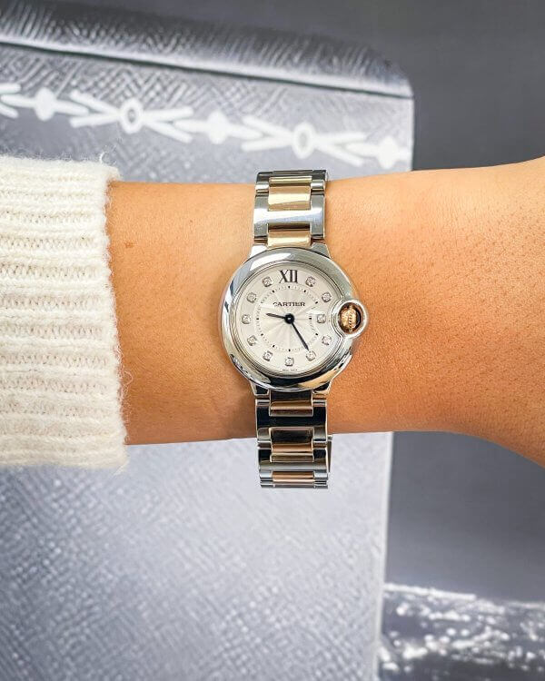 Cartier Ballon Bleu WE902030 28mm 18K Rose Gold and Stainless steel with a silver dial.